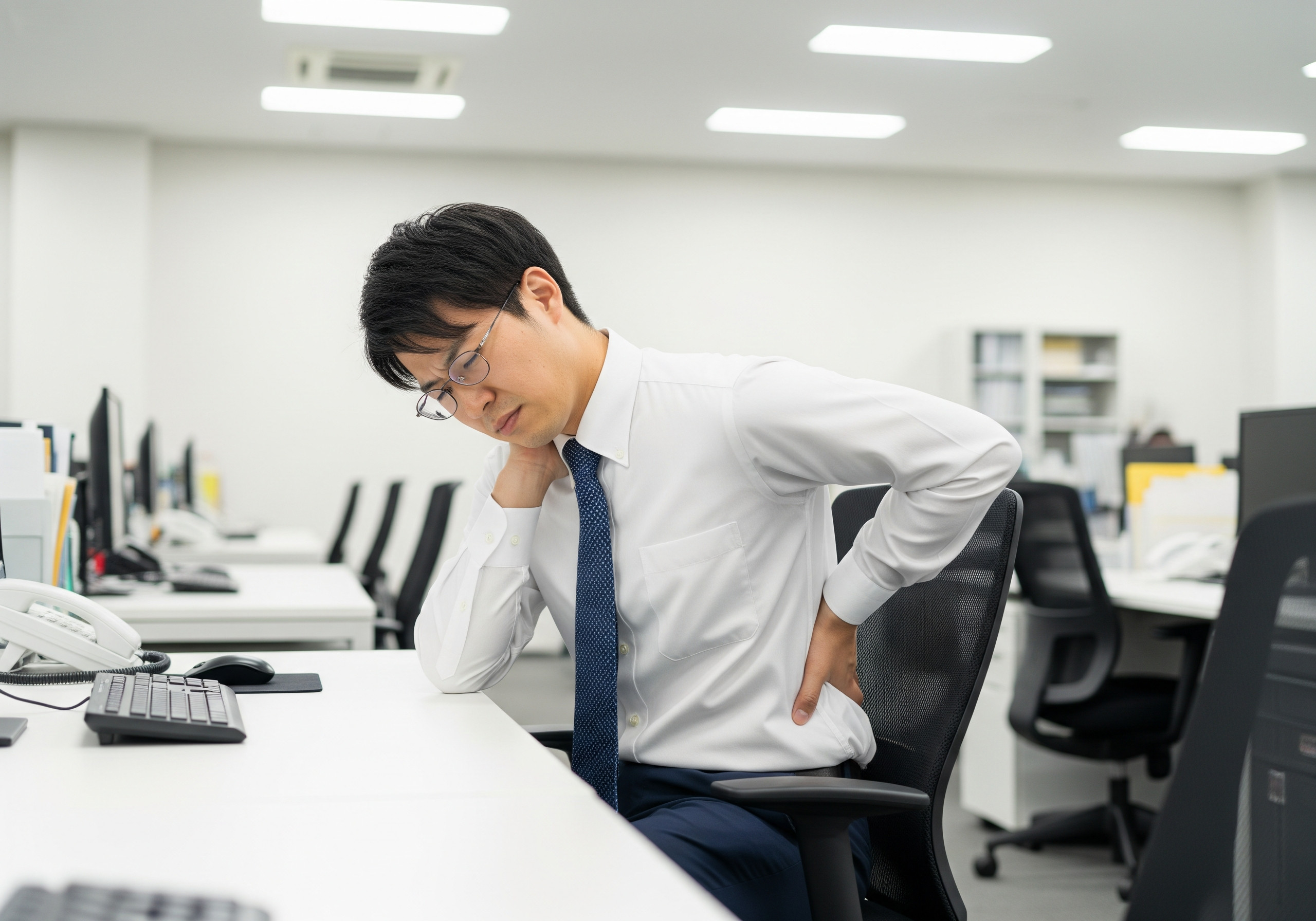 長時間のデスクワークや立ち仕事、家事で前かがみが続くと、腰や肩、首に負担が集中しやすくなります。筋肉のこわばりや関節の動きに制限が出ることで、腰痛や肩こり、背中の張りなどの日常の痛みにつながることがあります。